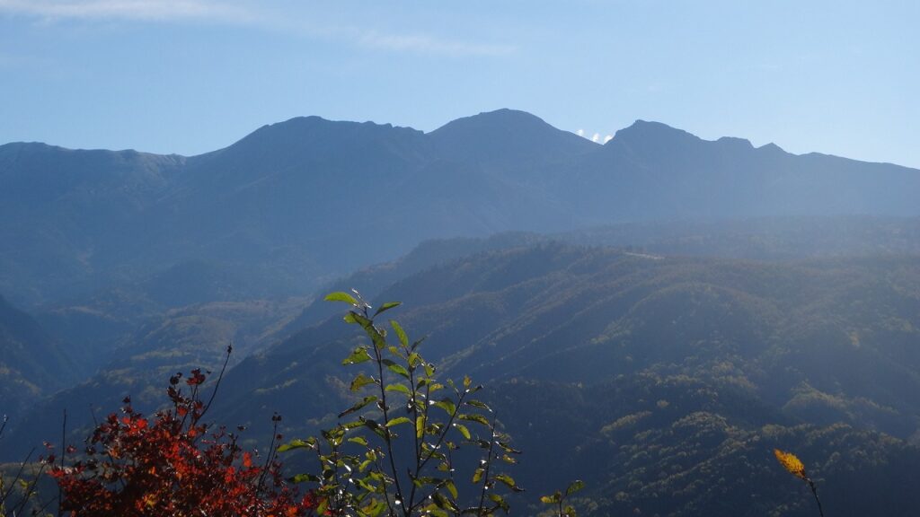 大逆光の御嶽山、ここまで上がってもまだ早かった。去年は11月に入ってから来て、少し早めにと思ったのに。